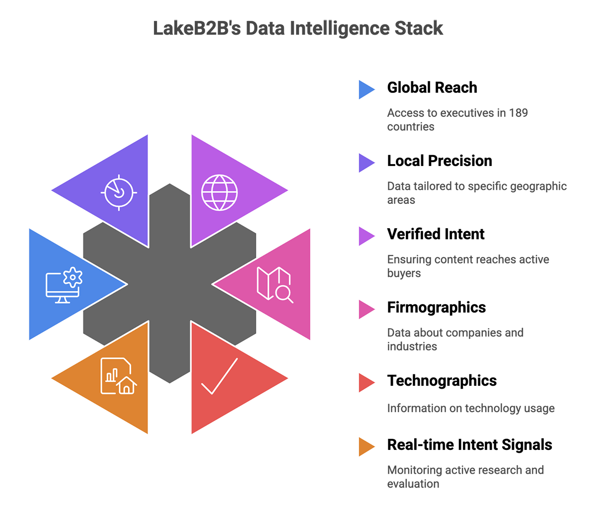 With over 810 million verified B2B executives across 189 countries, LakeB2B offers the industry’s most comprehensive data-driven syndication network. Our proprietary data intelligence stack combines firmographics, technographics, and real-time intent signals from 13,000+ monitored topics to ensure your content reaches only those who are actively researching, evaluating, and buying.