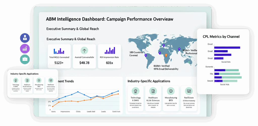 Our ABM Intelligence Dashboard offers real-time visibility into your campaign performance, showcasing engagement trends, CPL metrics, and account-level insights. With VisitorTech and ActiveLeads integration, marketers can monitor account intent evolution post-syndication.