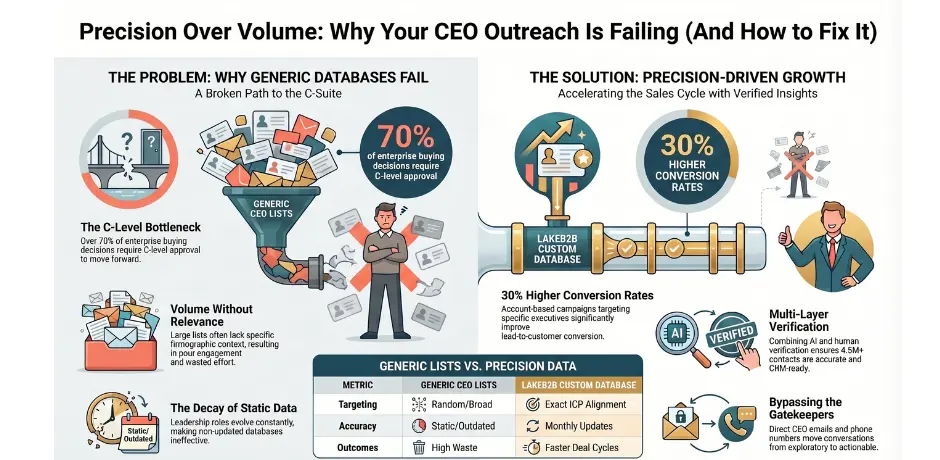 In B2B sales, timing and targeting define outcomes. And when you are selling to enterprises, access to CEOs is not optional. This is because over 70% of enterprise buying decisions require C-level approval. Moreover, Account-based campaigns targeting executives can improve conversion rates by up to 30%