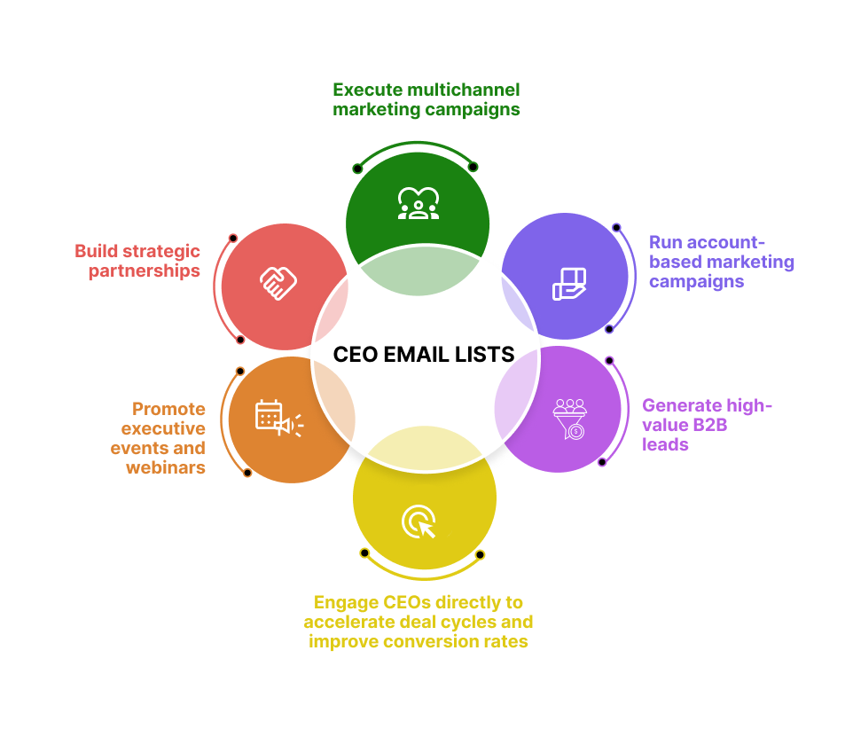 Businesses use CEO email lists for ABM campaigns, executive outreach, and enterprise sales.