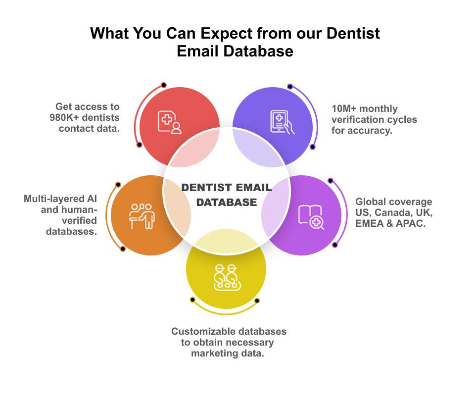 Our Verified Dentist Email List is compiled from authentic sources such as dental associations, clinic listings, and NPI databases. All the data is 100% consent-based and adheres to data compliance policies.