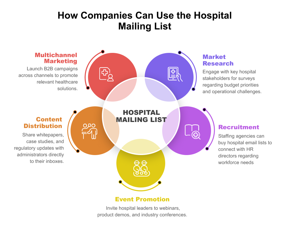By purchasing the hospital contact list, you get access to email addresses, phone numbers, direct mail addresses, and other relevant firmographic data for B2B marketing.