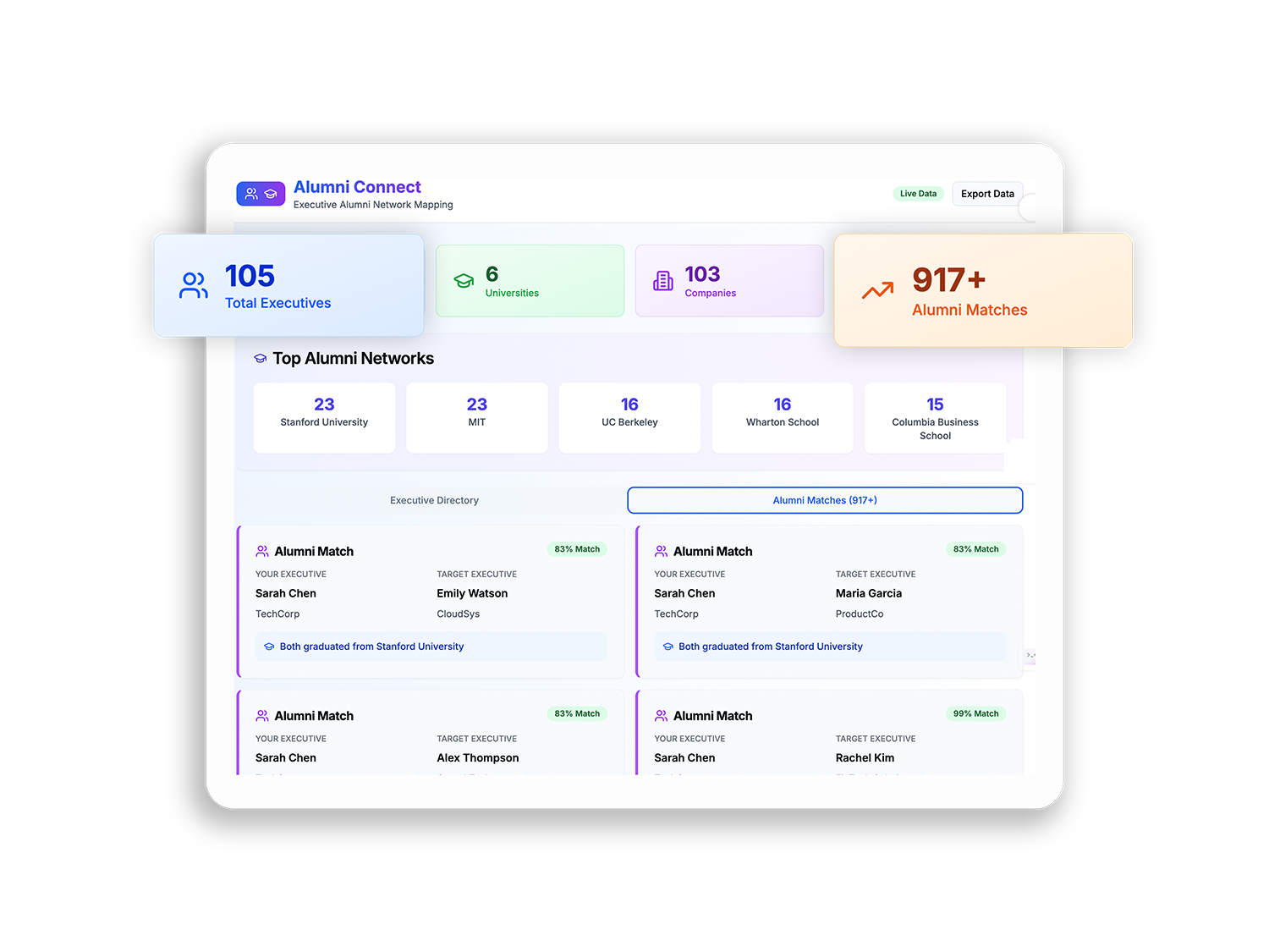 - Tracks alumni affiliations of Fortune 500 and Unicorn CEOs.
