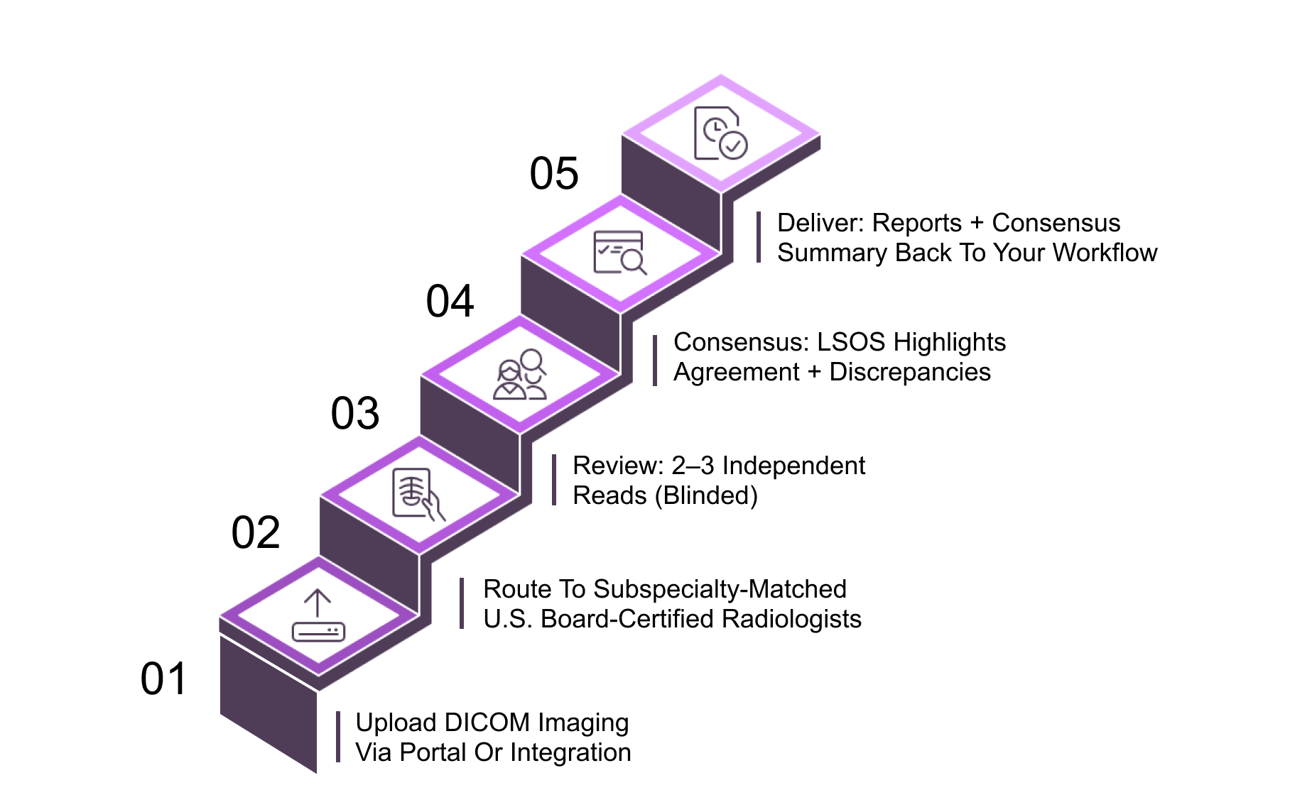 Upload a scan once. LSOS routes it to 2–3 independent U.S. board-certified radiologists (subspecialty-matched). You receive: