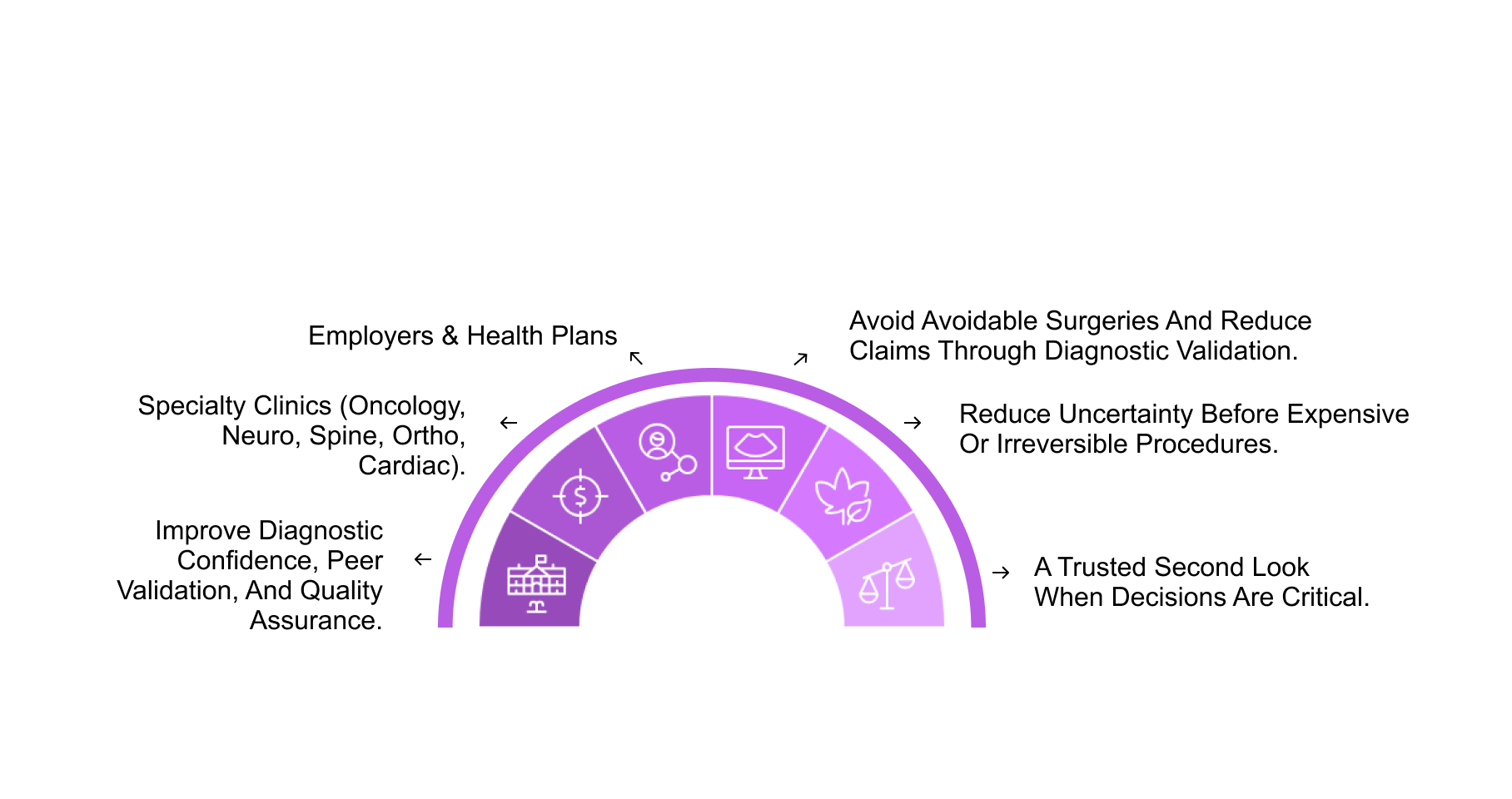 It enables multiple independent second opinions from U.S. board-certified radiologists, delivered as structured reports and a consensus summary—so clinicians and patients can make high-confidence decisions.