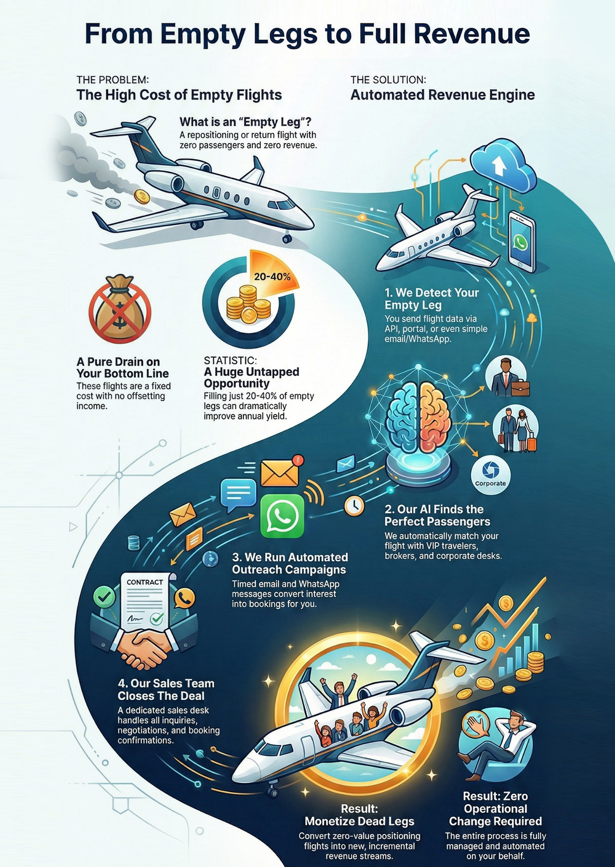 Every year, thousands of private charter flights globally operate as empty legs — repositioning, return sectors, or ferry flights with zero passengers and zero revenue.